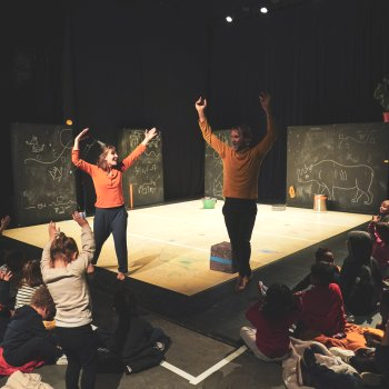 Dans ce spectacle entre danse théâtre et dessin, les deux interprètes nous invitent à laisser libre-cours à notre fantaisie : et si on pouvait récréer le monde ? Et d’ailleurs, le début c’était quoi ? Il était comment le monde avant qu’on l’appelle le monde ? On cherche, on trouve des réponses en danse, en mots, en dessin, on efface, on réessaie…même les objets sur le plateau essaient de nous aider ! Pourquoi un arbre est une poule ? invite les enfants comme les adultes à s’offrir le droit d’imaginer une autre réalité, un monde où tout devient possible, même dessiner sur les murs et le tapis !