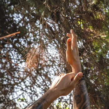 Pendant plusieurs mois, Marion Carriau et Maeva Cunci sont allées à la rencontre de groupes d’habitants et habitantes du Gard pour tisser des matériaux de récupération. Elles ont ensuite assemblé tous les tissages pour créer une grande canopée protectrice, installée sur le site du festival.